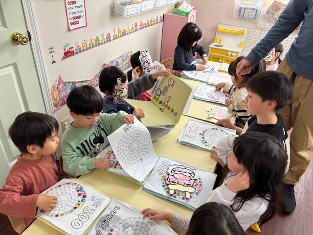 今日は節分なので、日本語タイムに、鬼のお面を作り、節分の豆の年の数だけ食べました。