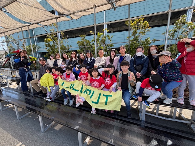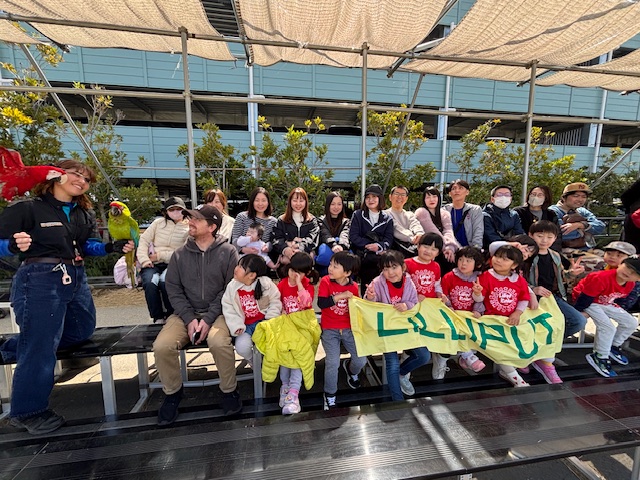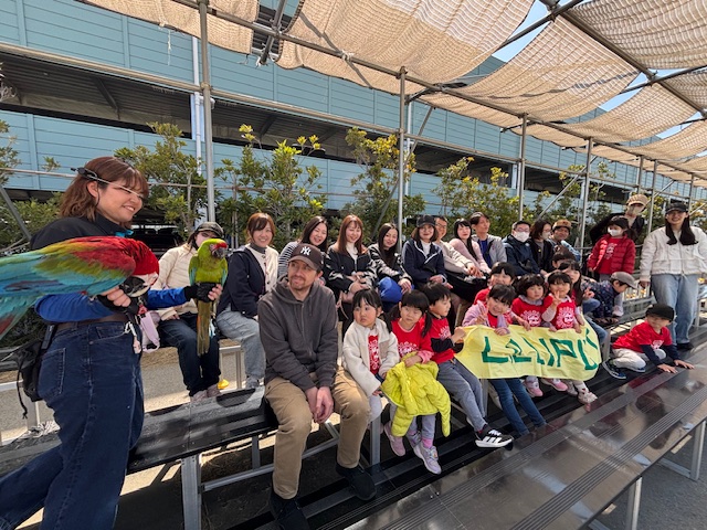 終わってから、全員で写真を撮った時に、ショーを見せてくれたスタッフの方が、インコ2羽と一緒に、記念写真に入ってくれました。