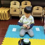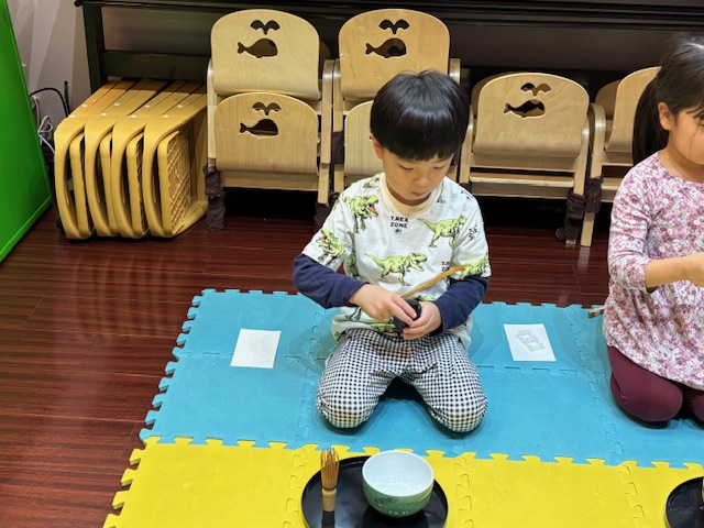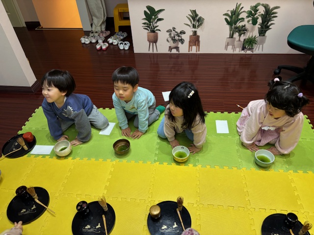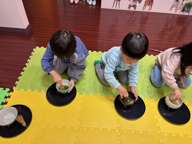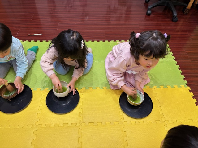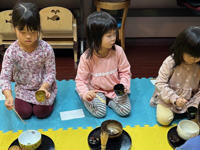 次に、交代で、小さい子たちがお茶を点てて、年長さんがいただきます。