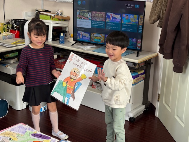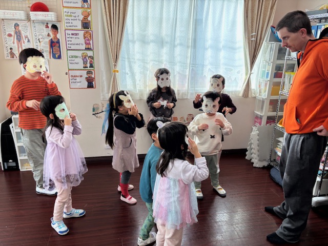 今日は、日本語タイムで、動物のお面の色塗りをしたら、子ども達みんな大喜びで、Mr.Jに見せていました。