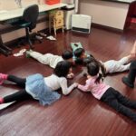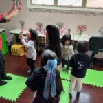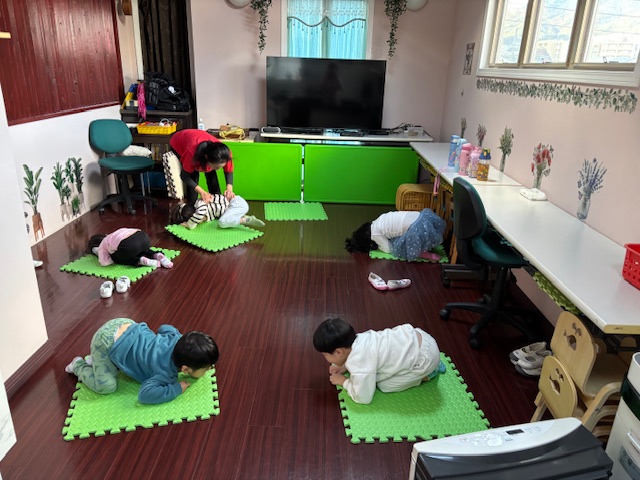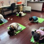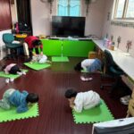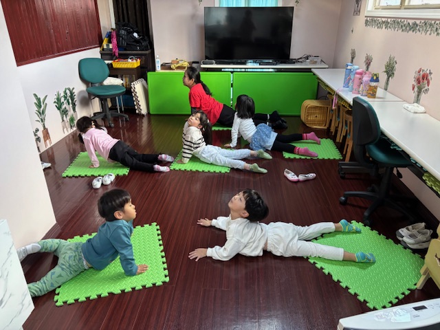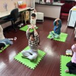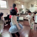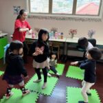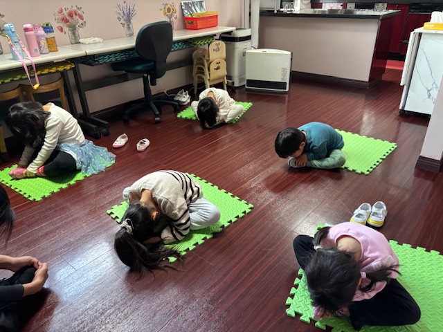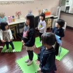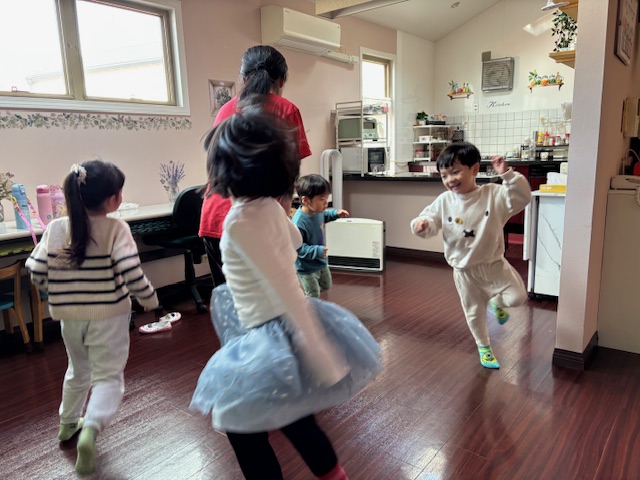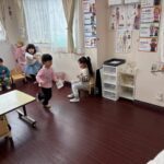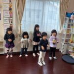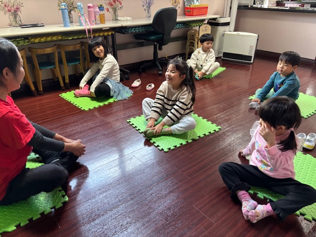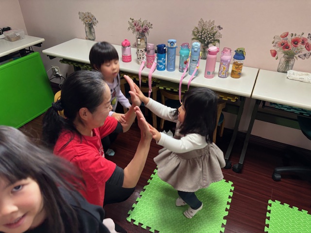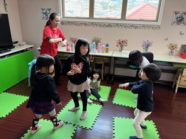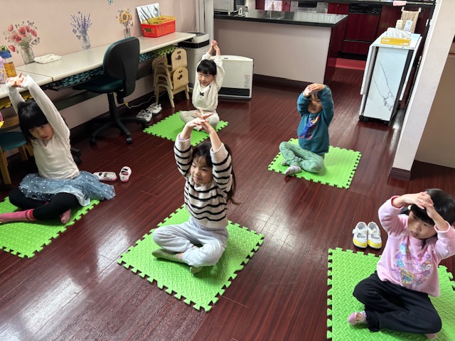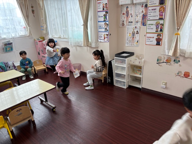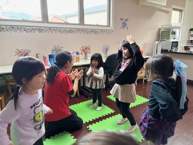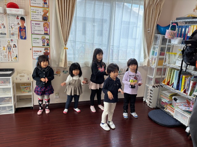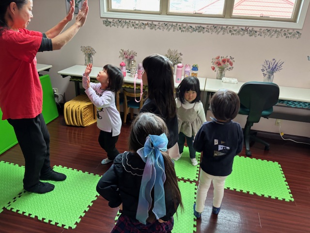 英語レッスンでは、みんなに混じって英語のうたのアクションをしていました。