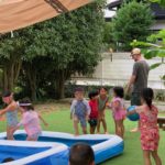プール遊びの途中で雨が降り出しましたが、子ども達はすでに濡れているので