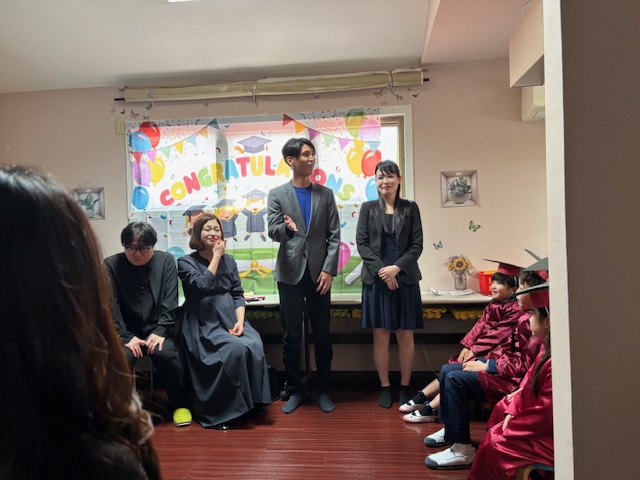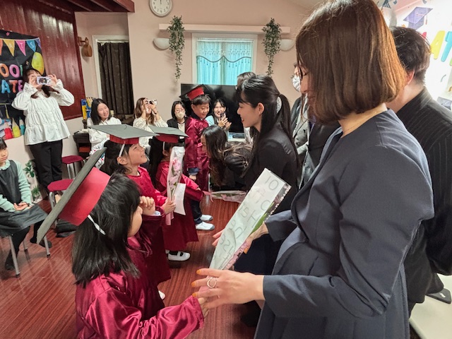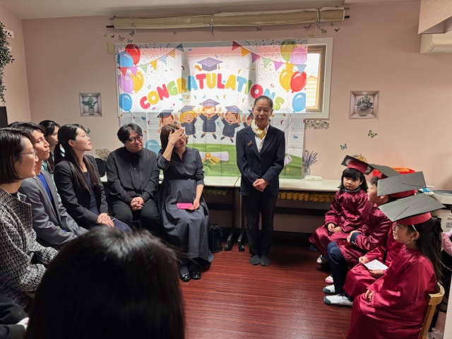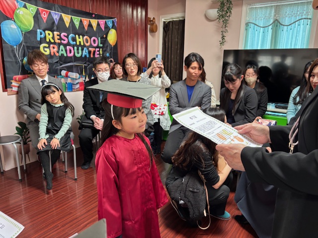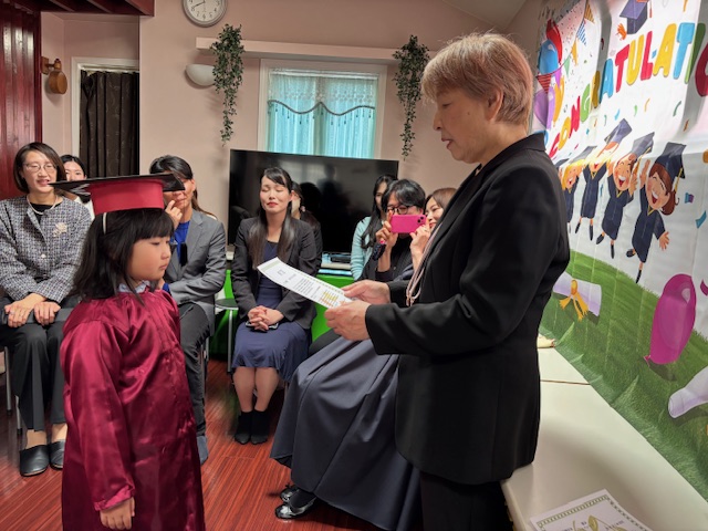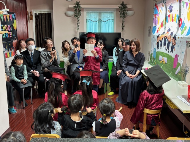 次に、年中さん、年少さん、卒園生の順に終了証を手渡し、そのあと、卒園生のパパママの挨拶。
