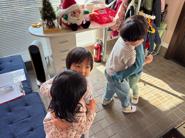 登園してきた子達は、玄関でのお仕事を済ませて2Fの教室に上がっていきます。